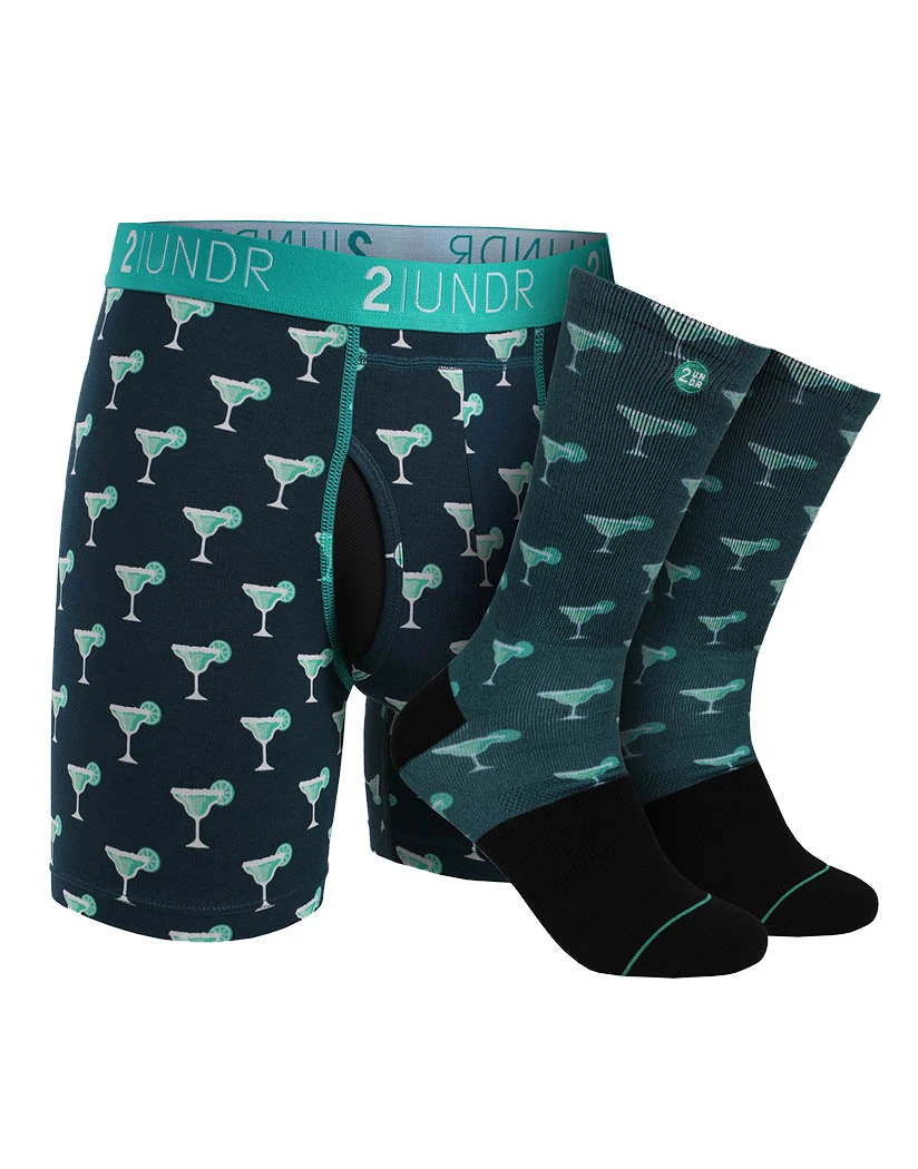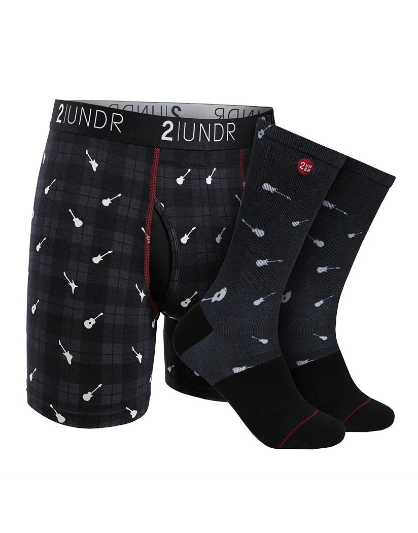 The 2UNDR Swing Shift Boxer Brief Sock Pack is super convenient. The pack contains one boxer brief and one pair of socks. The boxer brief style underwear is of tagless, patterned fabric with flatlock seams to prevent chafing and other irritation. The mid-rise boxer brief has a thick, exposed elastic waistband with anti-roll technology. The patented Joey Pouch® with a fly front access strongly supports you without squishing or squeezing. This pouch comes with a No-Drip-Tip™ with a hydrophobic membrane to keep you cool and dry. The compression-style socks are also patterned. They have targeted ventilation and seamless toe closure. These socks have compression arch support for an amazing fit. Try these two together today.