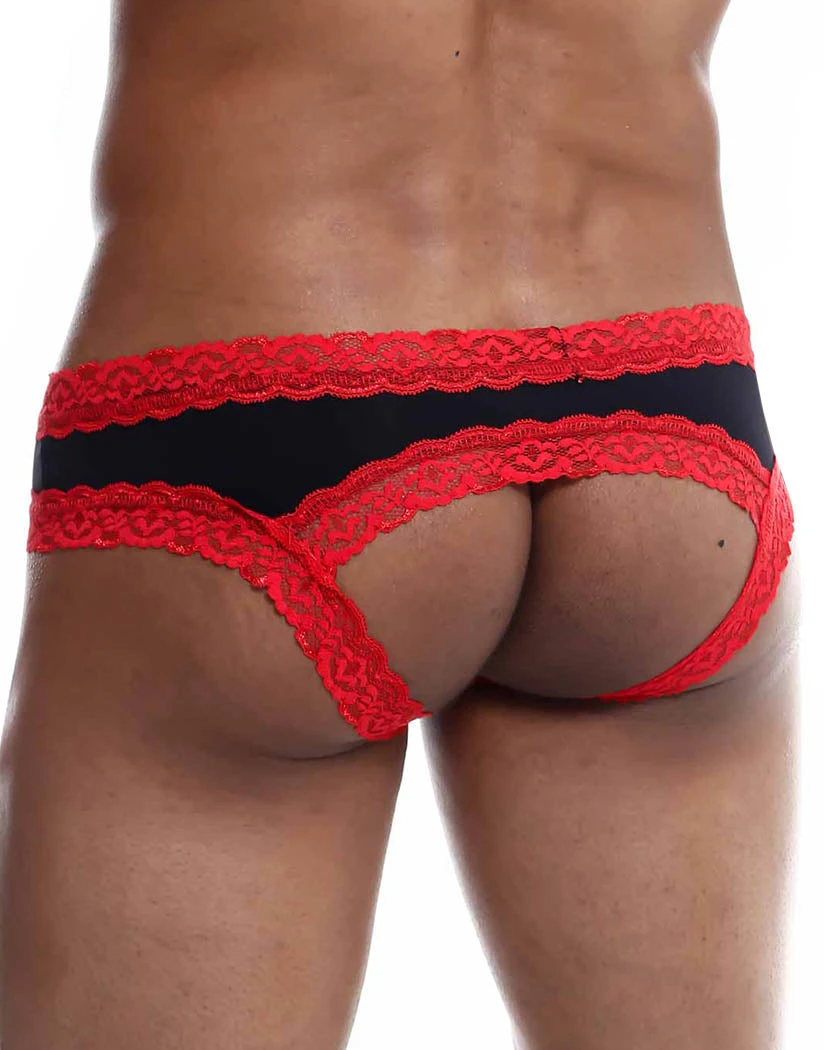 The MOB Lace Jock Bikini is flirty but provides you with a relaxed feel. The bikini style underwear is made of smooth, soft fabric trimmed with contrasting lace. The low rise waist is held up by a wide lace waistband. The back design is unique, with a wide cut out that leaves you fully exposed. Back straps provide you with a boost and hold you securely in place. You’ll love the way this bikini looks and fits.