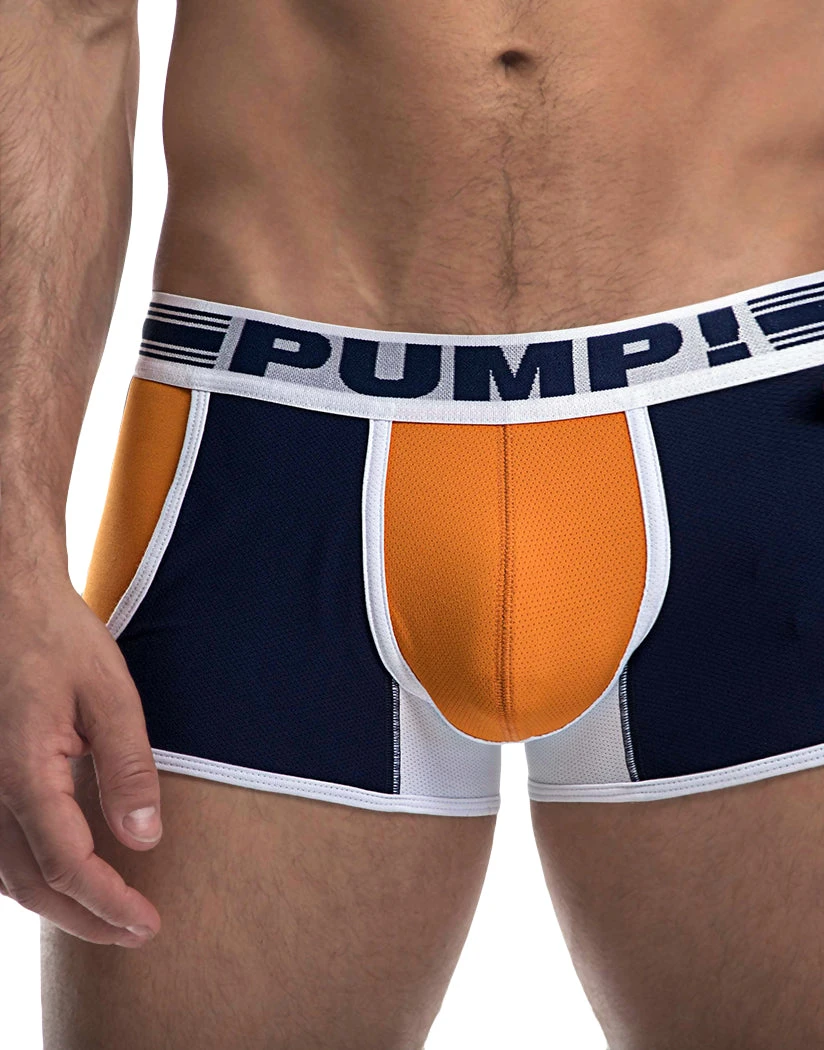The Varsity Jogger Trunk from PUMP! is a low-rise boxer short style trunk underwear that scores big when it comes to comfort and style. This athletic look features a breathable mibrofiber and mesh construction in with a bold pop of color. The front has a supportive contour pouch with contrast stitching and piping. Elastic leg bands around the leg openings help keep this men’s underwear in place. With a tight, body-hugging fit, this boxer short from PUMP! is perfect to wear while working out, or lounging about.